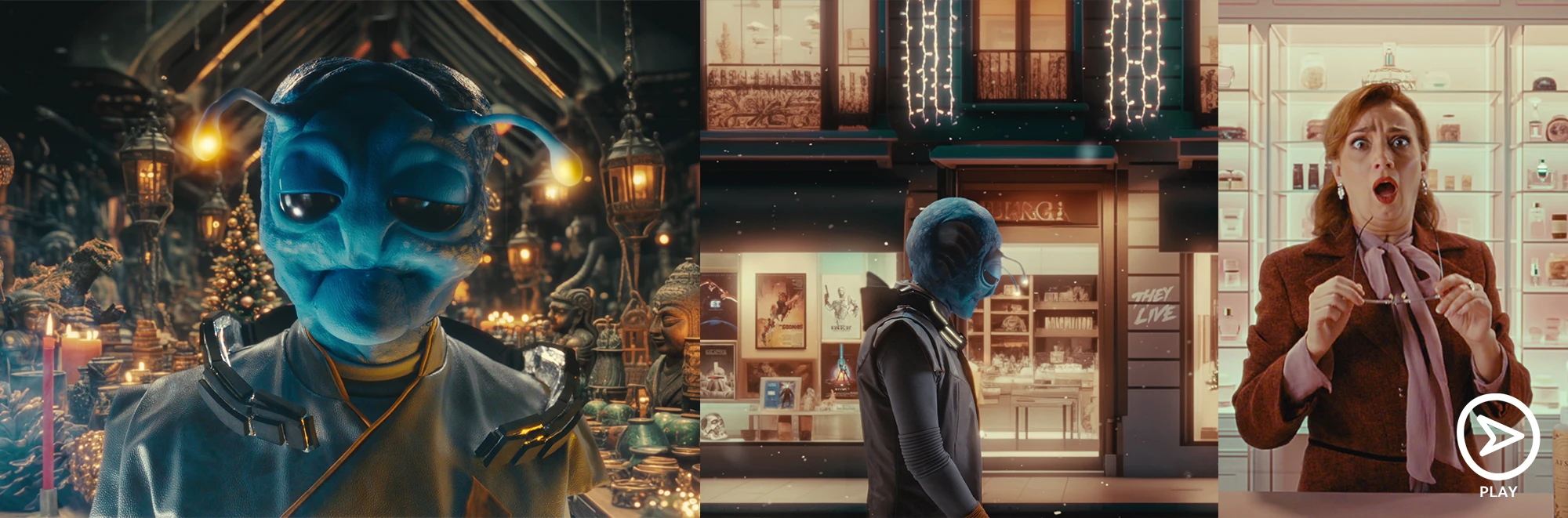 Grazie! Lo spot Juice appartiene a una singolare campagna pubblicitaria per l’omonimo reseller Apple. È un progetto nato dalla sinergia con il loro dipartimento comunicazione, in particolare con Antonio De Santis, con cui condivido una spiccata nerditudine. Credo che mi abbiano scelto perché cercavano idee bizzarre supportate da un apparato visivo che scardinasse la proverbiale diffidenza di Apple, ma con un assetto produttivo agile. Quando il concept prescelto (di Francesca Della Valle) ci ha trasportati nei territori della sci-fi, io e i miei collaboratori ci siamo subito interrogati su come affrontare i VFX. Senza dubbio la parte più difficile è stata dare vita al protagonista alieno, interpretato dal mimo Niba: una missione sulla quale abbiamo concentrato i maggiori sforzi produttivi. Ed essendo la campagna ispirata alla fantascienza vintage, ho optato per una tecnica mista che strizzasse l’occhio al cinema e alle tecniche del passato. In pratica, la creatura aliena – disegnata da Max Macellari – è frutto di una spericolata combo di effetti di make up e digitali. I primi rappresentano una sfida sul set, perché richiedono tempi lunghi di applicazione e inibiscono la mobilità dell’interprete. I secondi – realizzati in larga parte da Tommaso Malaisi – complicano di molto la post, in quanto non solo debbono aderire alla recitazione e ai movimenti dell’attore, ma anche amalgamarsi perfettamente con gli effetti “practical” (la maschera di gomma, per capirci). Finora abbiamo realizzato due spot, e i più attenti noteranno che nel secondo, i VFX hanno preso il sopravvento sul trucco prostetico. Spesso in questo lavoro, i tempi dettano i modi.